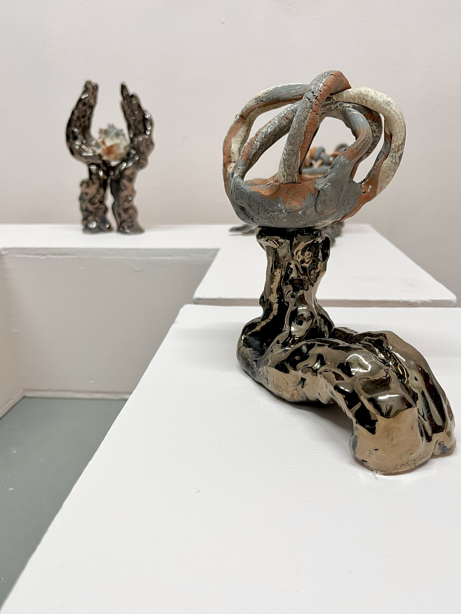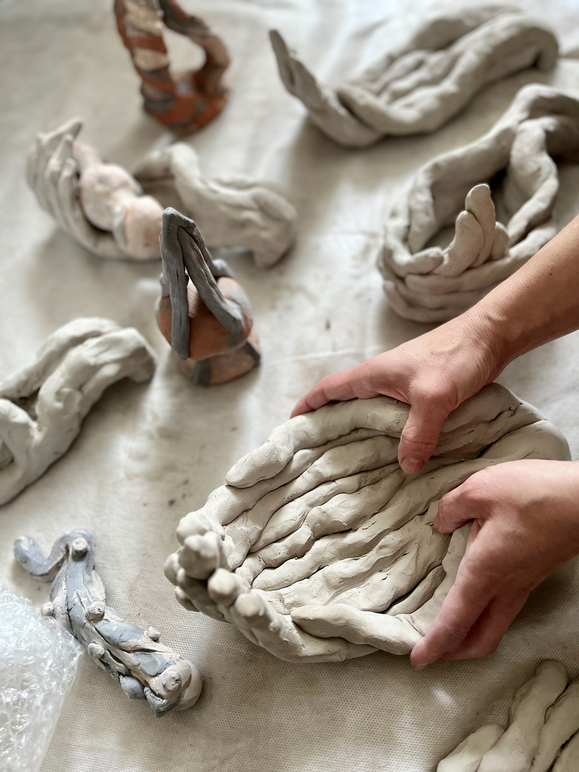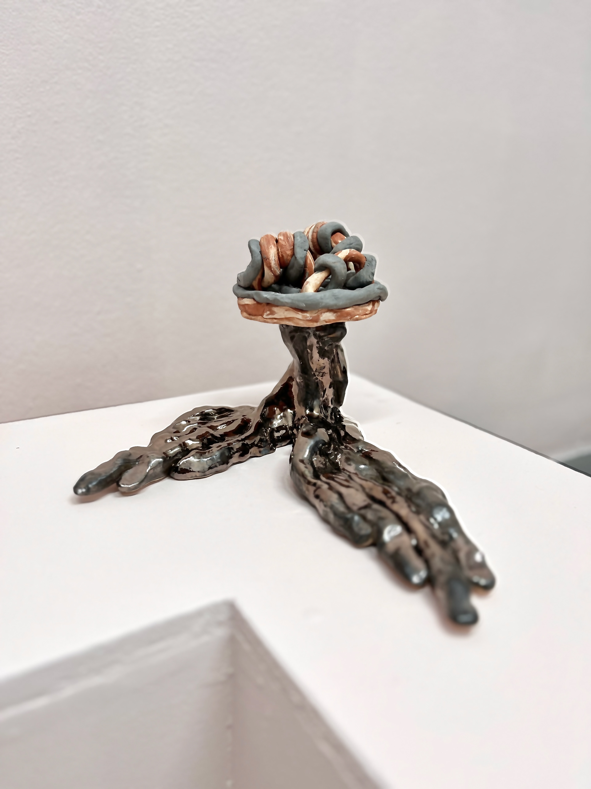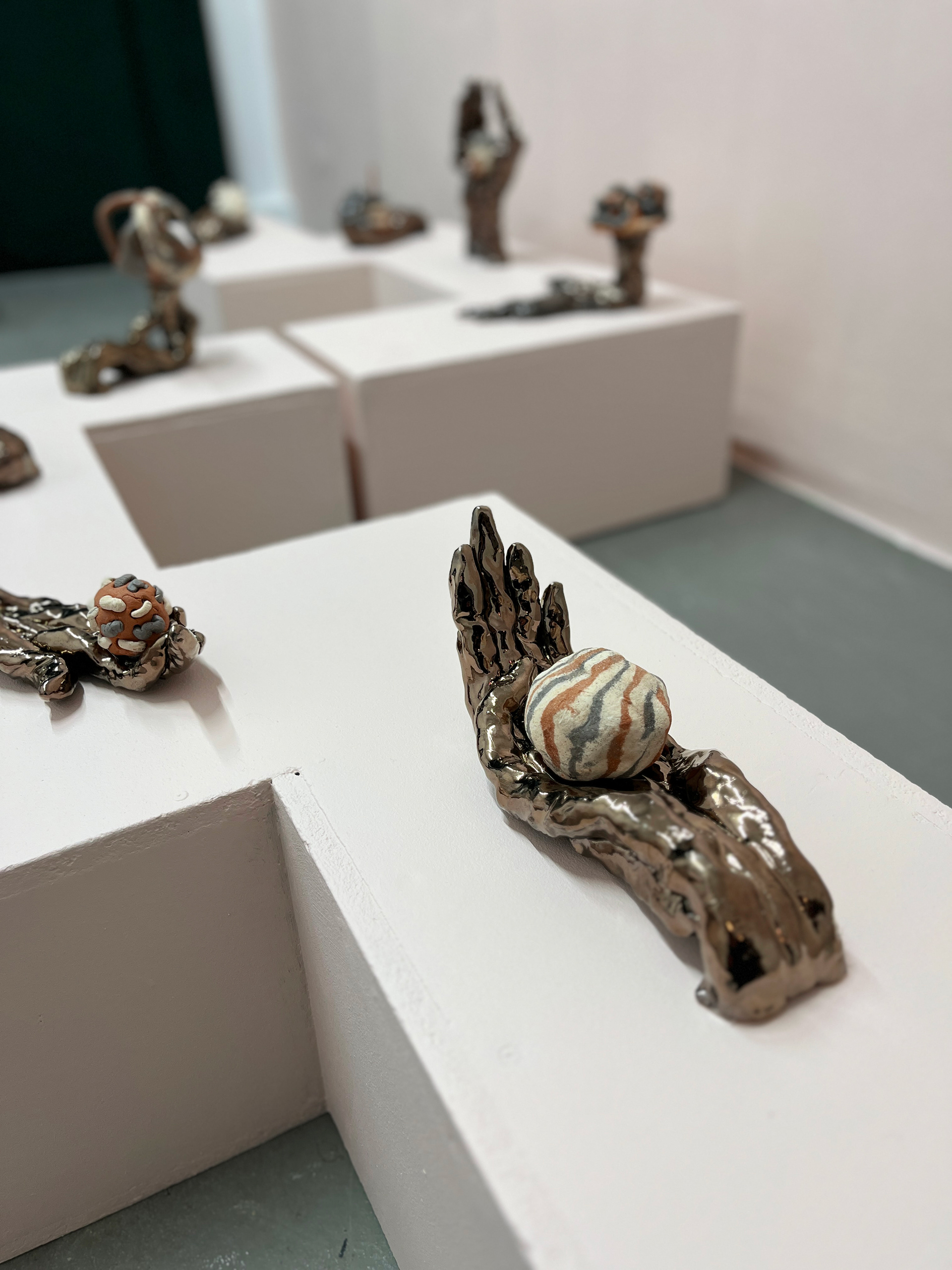 Antypodręcznik. Jak zbudować niewidzialne miejsce? Wystawa zbiorowa w CSW Kronika. 18 listopada 2023 ‒ 12 stycznia 2024 Kuratorka: Marta Lisok Współpraca kuratorska: Dominik Ritszel, Jolanta Jastrząb (…) Ekspozycja stawiała nacisk nie tylko na wrażenia wizualne, ale także słuchowe, dotykowe i zapachowe. Artyści i pacjenci za pomocą zmysłów starali się definiować wrażenia płynące zarówno z ich świadomości, pamięci, jak i ciała. Realizacja Naczynia (2023) stanowiła zapis działań Natalii Kopytko z podopiecznymi szpitala. Narzędziem pracy artystki i uczestników stała się glina. Pacjenci tworzyli formy inspirowane bezoarami, które powstają w żołądkach ludzi i zwierząt w wyniku niestrawionych włókien, włosów czy nawet leków. W średniowieczu przypisywano im magiczne i lecznicze moce. Współcześnie traktowane są jako jedne z symptomów zaburzeń odżywiania. W kontekście działań artystki, odzwierciedlają one formy napięć w ciele. Kopytko umieściła prace swoich podopiecznych w naczyniach przypominających kształtem ludzką dłoń, co szczególnie podkreślało taktylny, haptyczny wymiar jej działań z pacjentami, akcentując w ten sposób terapeutyczny charakter dotyku. (…) Zuzanna Sokołowska, Linia Prosta magazine