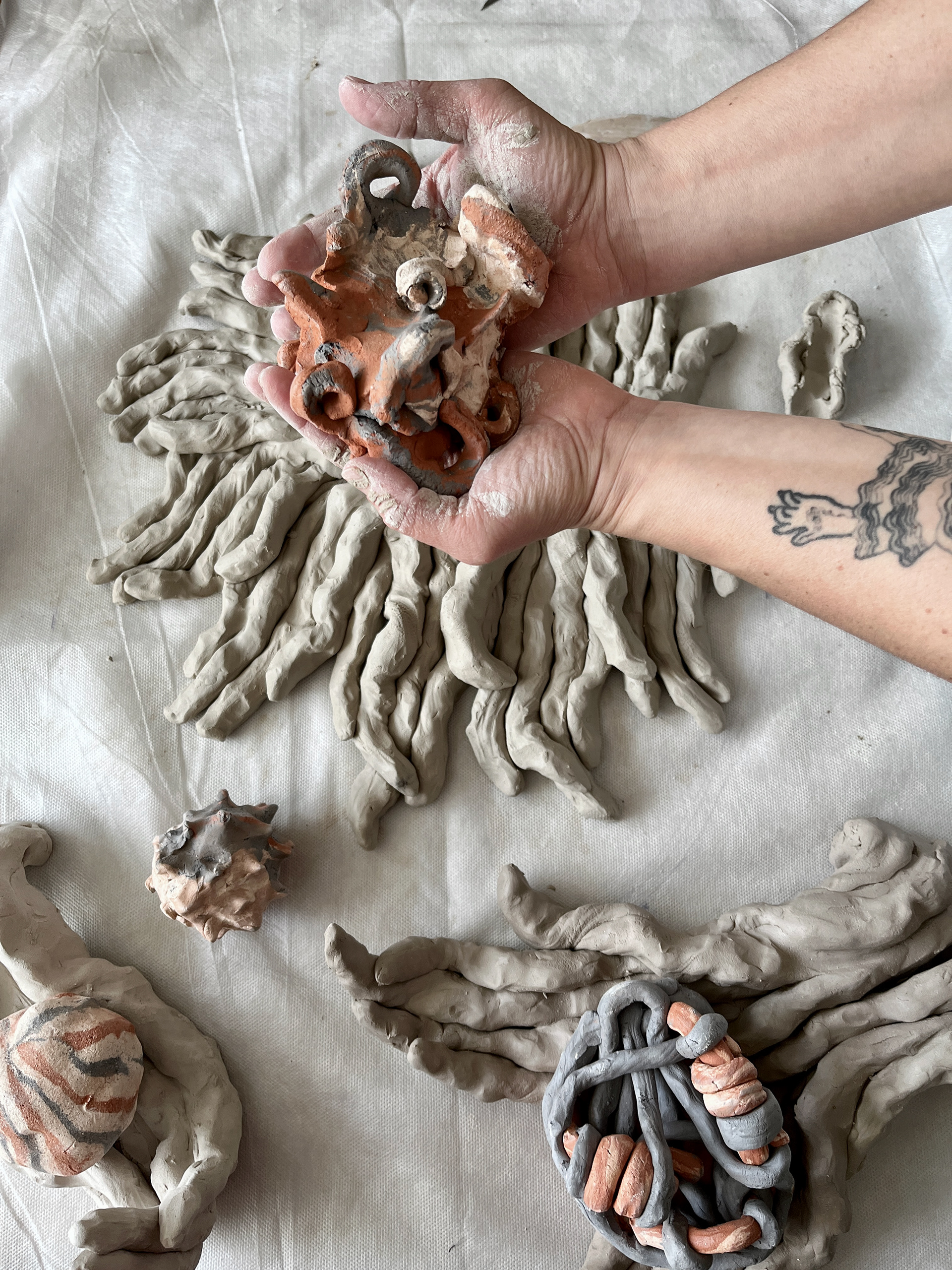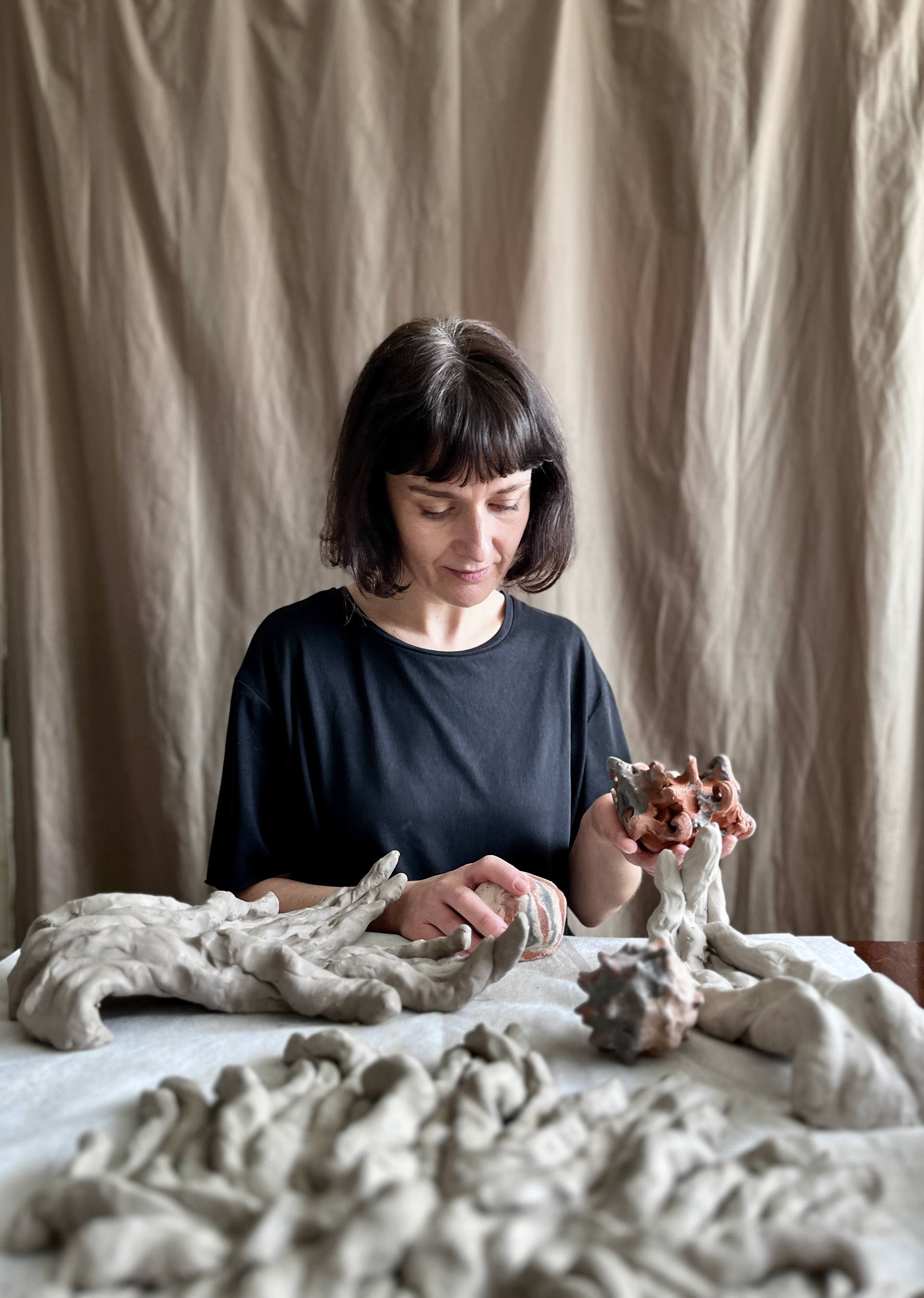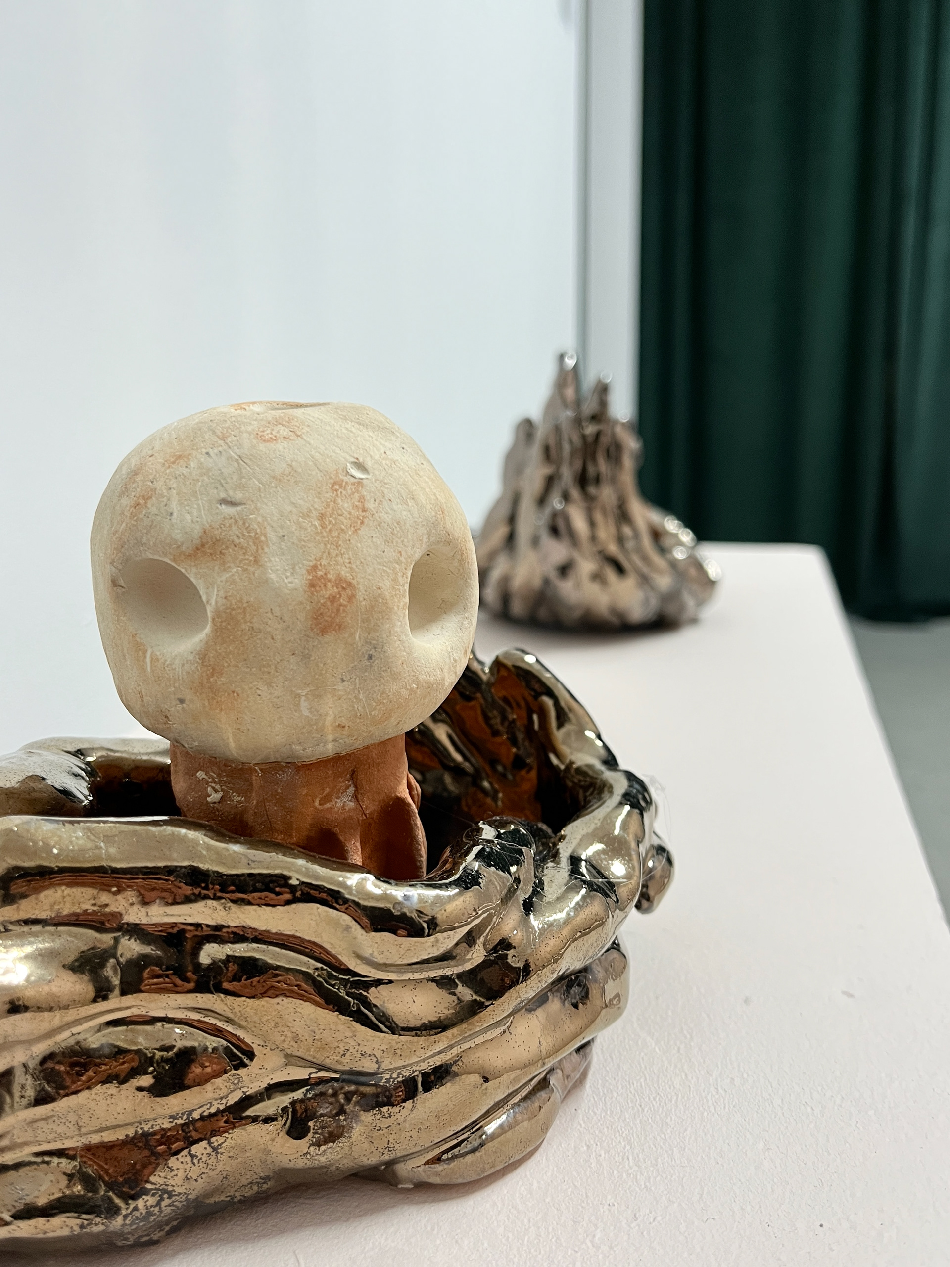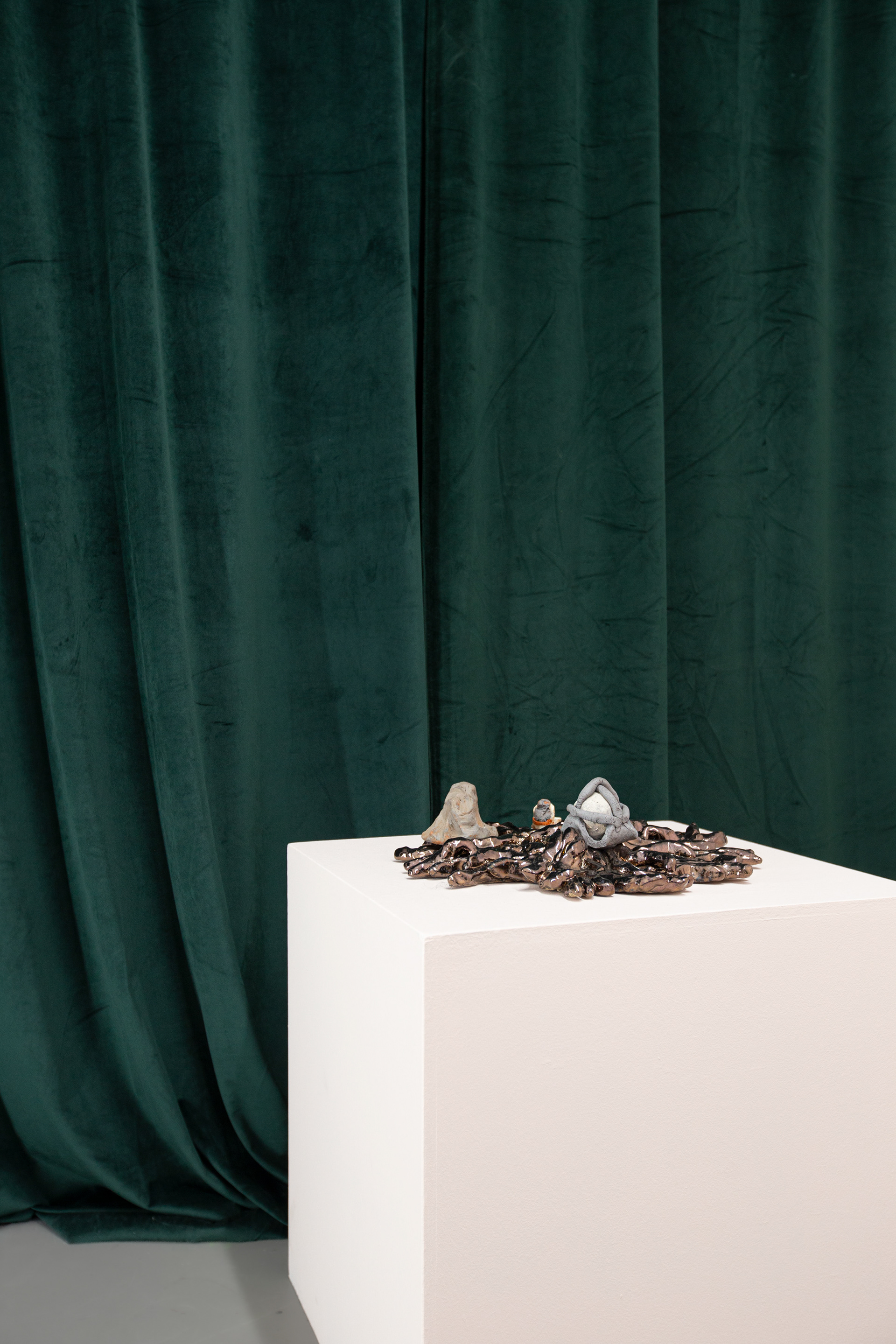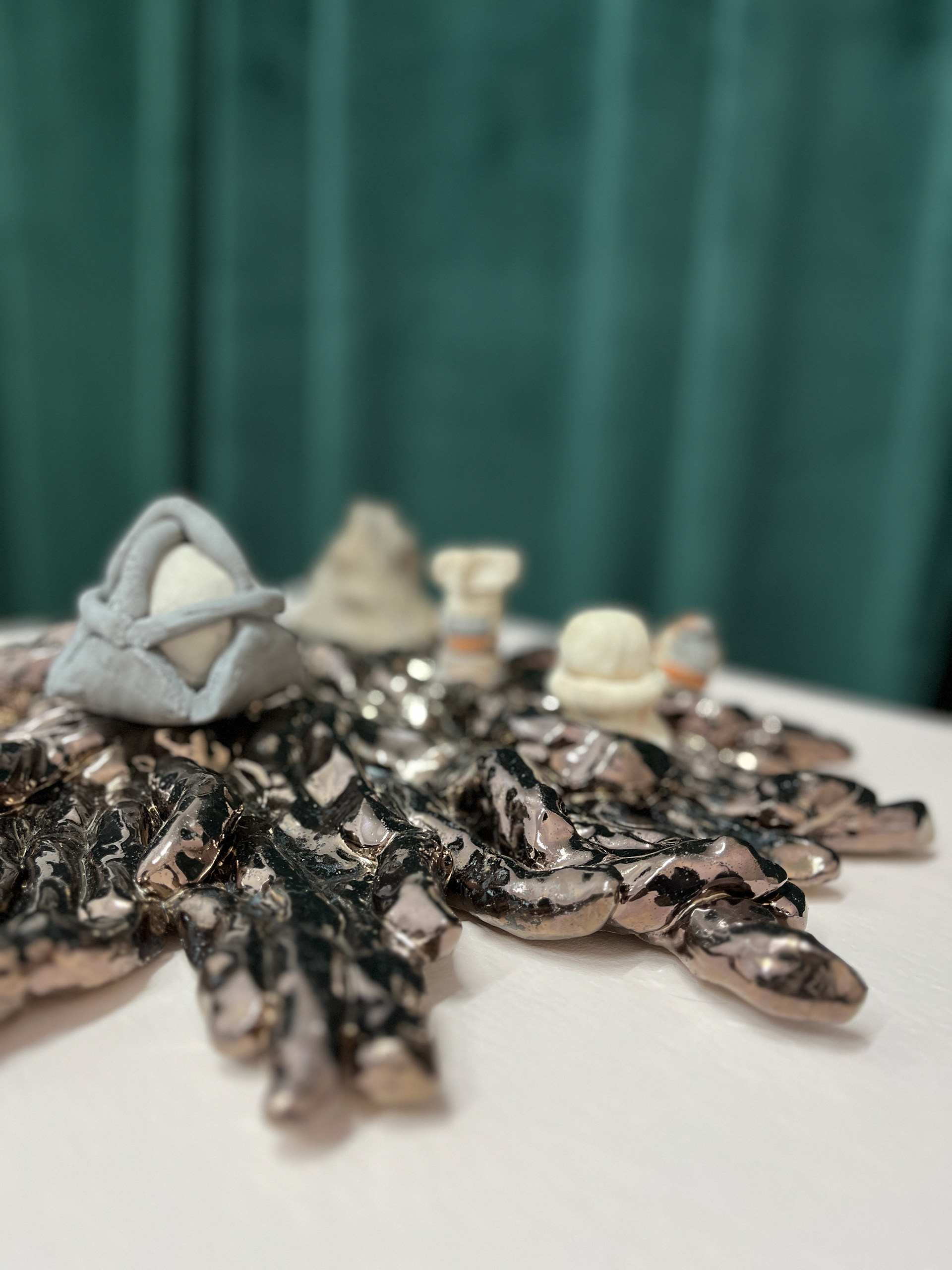 Antypodręcznik. Jak zbudować niewidzialne miejsce? Wystawa zbiorowa w CSW Kronika. 18 listopada 2023 ‒ 12 stycznia 2024 Kuratorka: Marta Lisok Współpraca kuratorska: Dominik Ritszel, Jolanta Jastrząb (…) Ekspozycja stawiała nacisk nie tylko na wrażenia wizualne, ale także słuchowe, dotykowe i zapachowe. Artyści i pacjenci za pomocą zmysłów starali się definiować wrażenia płynące zarówno z ich świadomości, pamięci, jak i ciała. Realizacja Naczynia (2023) stanowiła zapis działań Natalii Kopytko z podopiecznymi szpitala. Narzędziem pracy artystki i uczestników stała się glina. Pacjenci tworzyli formy inspirowane bezoarami, które powstają w żołądkach ludzi i zwierząt w wyniku niestrawionych włókien, włosów czy nawet leków. W średniowieczu przypisywano im magiczne i lecznicze moce. Współcześnie traktowane są jako jedne z symptomów zaburzeń odżywiania. W kontekście działań artystki, odzwierciedlają one formy napięć w ciele. Kopytko umieściła prace swoich podopiecznych w naczyniach przypominających kształtem ludzką dłoń, co szczególnie podkreślało taktylny, haptyczny wymiar jej działań z pacjentami, akcentując w ten sposób terapeutyczny charakter dotyku. (…) Zuzanna Sokołowska, Linia Prosta magazine